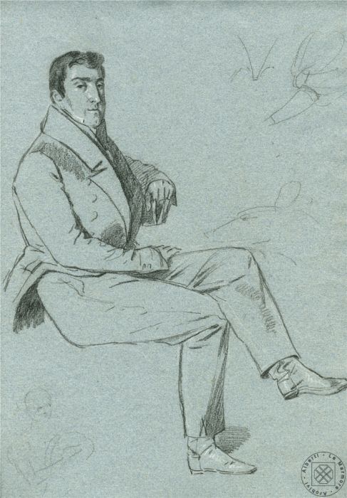 Tredicesimo figlio e ottavo dei maschi di Celestino e Raffaella Ferrero della Marmora. Fu battezzato lo stesso giorno della nascita; suoi padrini furono lo zio Paolo e la contessa Vittoria di Levaldigi. Nacque cinque mesi dopo la morte del padre. Sceglie, a differenza dei fratelli, la carriera civile che percorre fino a raggiungere il massimo grado di intendente generale. Con questo incarico presta servizio nelle sedi di Annecy, Chambéry e Genova. La sua capacità nelle discipline amministrative gli vale come posizione a riposo la nomina a Consigliere della Camera dei Conti. Nella fotografia: PIETRO AYRES - Ottavio Ferrero della Marmora. n. 7 di 17 studi a carboncino su carta azzurra per la grande tela: “La famiglia La Marmora”, cm 56 x 37. Biella, Archivi Alberti La Marmora. |